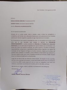 San Cristóbal, R D. – El exregidor por el municipio de san Gregorio de nigua, Héctor Moreno Bivieca, renuncio hoy como miembro del partido de la Liberación dominicana ( P L D), donde milito por mas de treinta años de manera ininterrumpida.